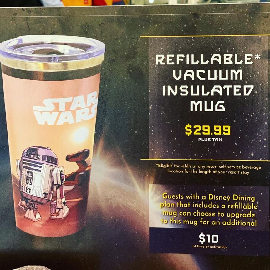 New refillable mug option keeps drinks hot or cold for hours! Just a $10 upgrade if you’re on the Disney Dining Plan and makes for a great souvenir!